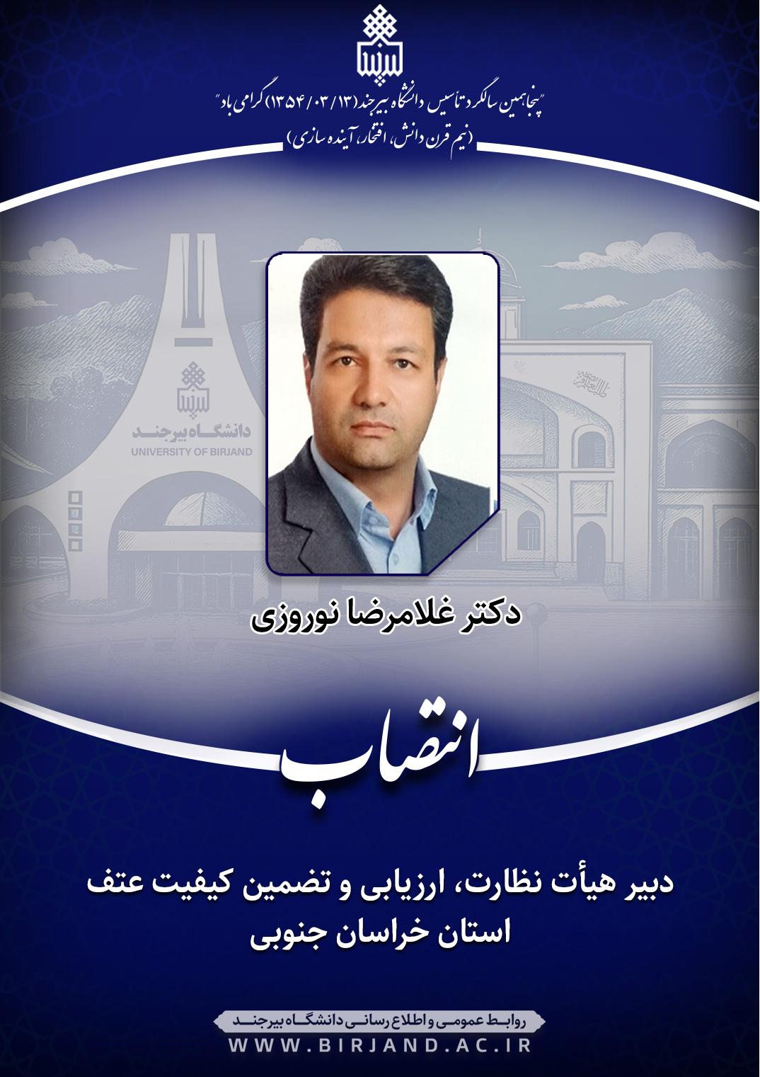 براساس ابلاغی از سوی دکتر نسیم نهاوندی، رئیس محترم مرکز نظارت و ارزیابی و تضمین کیفیت علوم، تحقیقـات و فنـاوری وزارت عتف،، دکتر غلامرضا نوروزی، عضو هیأت علمی گروه آموزشی مهندسی معدن، به سمت دبیر هیئت نظارت، ارزیابی و تضـمین کیفیت اسـتان خراسان جنوبی منصوب شد.